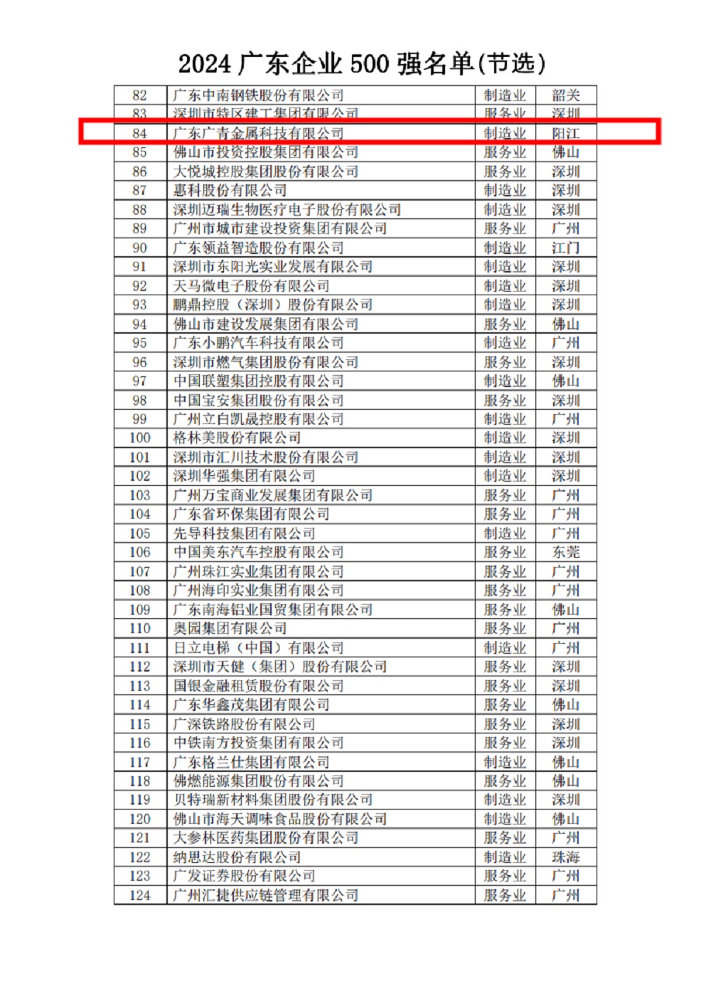2024广东企业500强榜单公布,广青科技位列第84位!